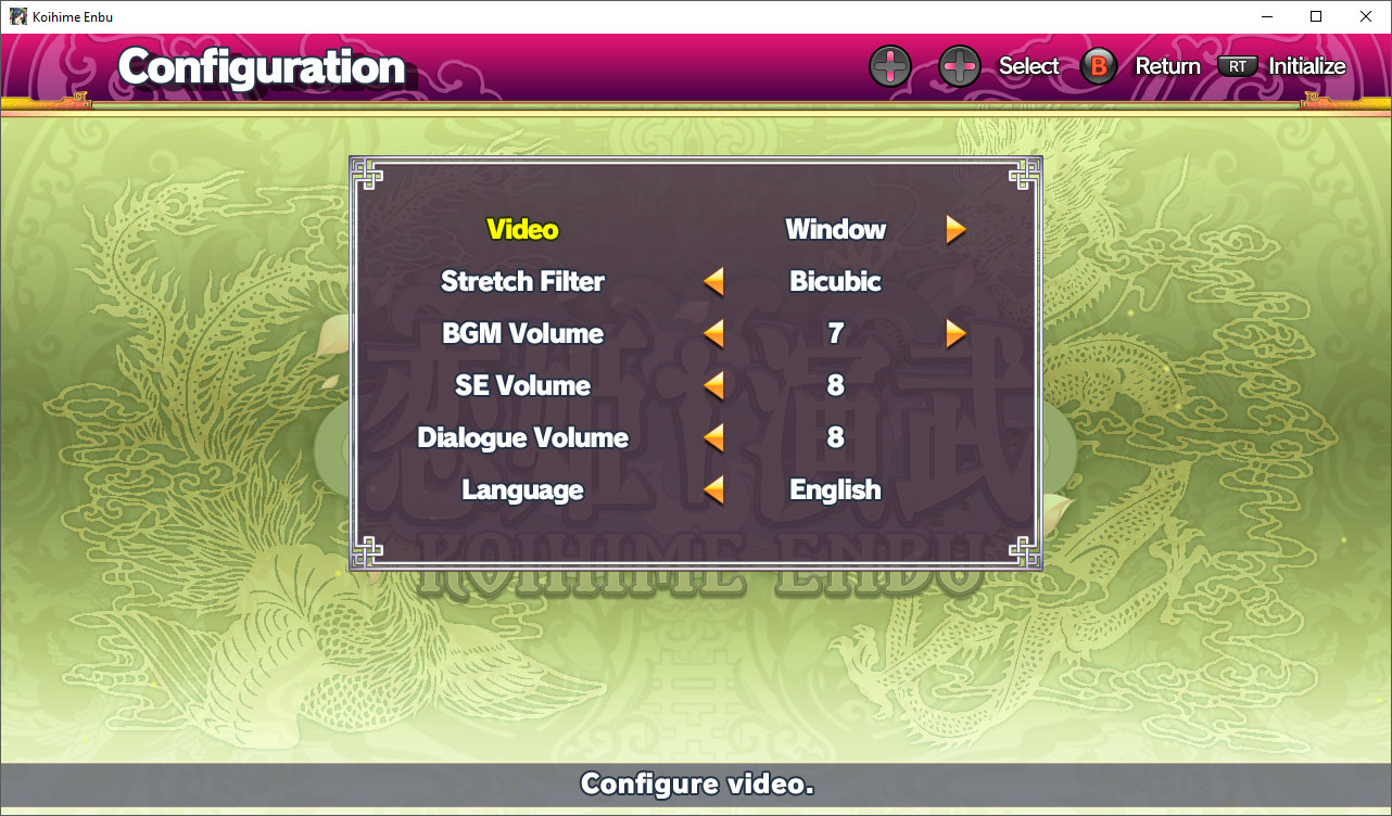 Originally an arcade fighting game, Koihime Enbu was ported to consoles back in January, but only available in Japan. Thanks to publisher Degica Games, an English release is now available here in the West on PC. Now, what this means is that the game itself is mostly the same from its console counterpart. The original text has either been replaced or supplemented with smaller, English text. There’s not a lot of options when it comes to graphics: just an option to set the game either windowed or full-screen mode, plus an stretch filter to try to smooth out the graphics. Thankfully, you can use a separate key configuration tool to set up your DirectInput controllers or arcade sticks before launching the game. Even better if you have an XInput device, since the game supports them automatically which allows you to just plug in and play.